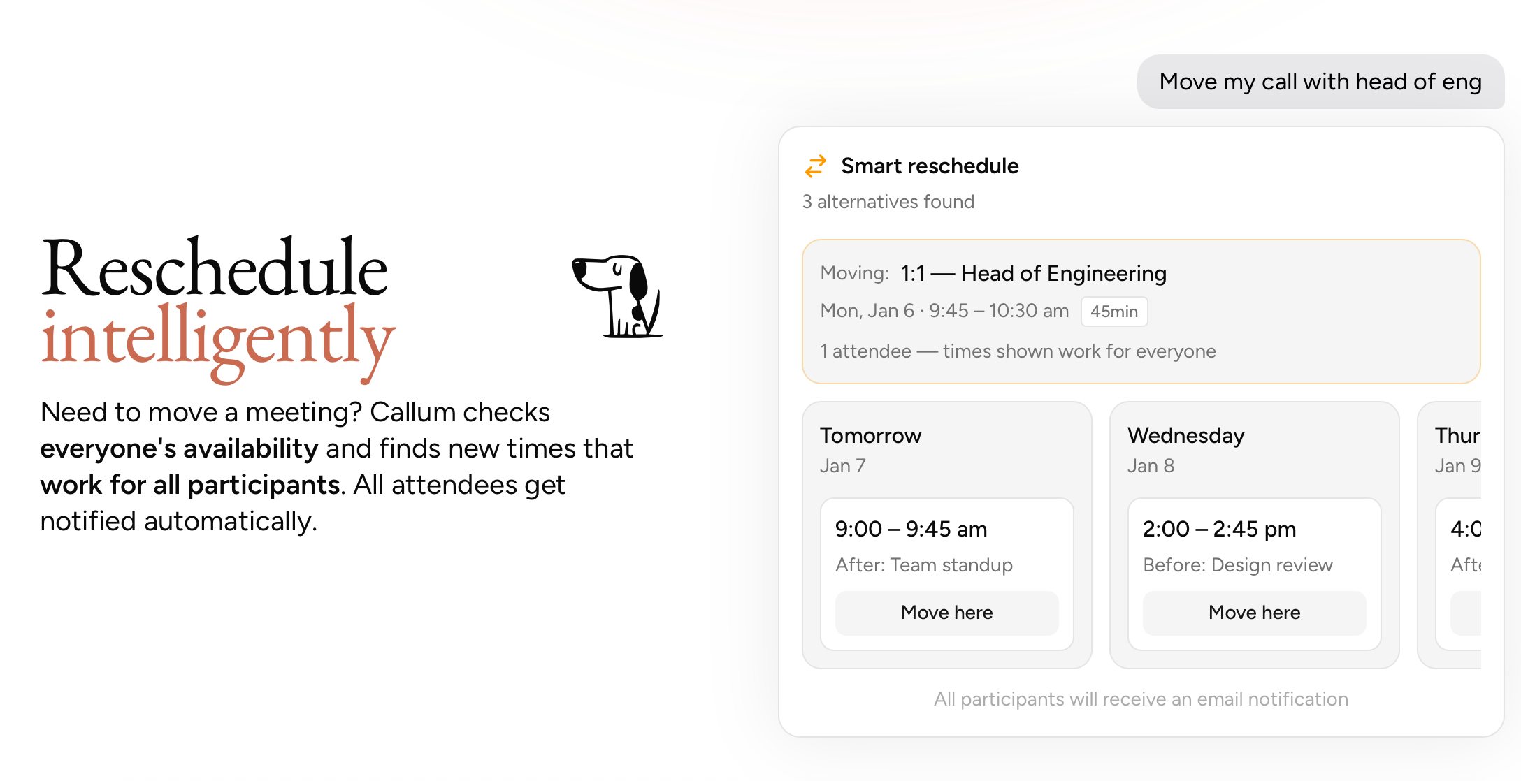 Callum is an AI assistant that simplifies team scheduling by managing Google Calendar meetings automatically. It handles multi-person availability and real-world constraints, letting you schedule and reschedule just by using natural language.