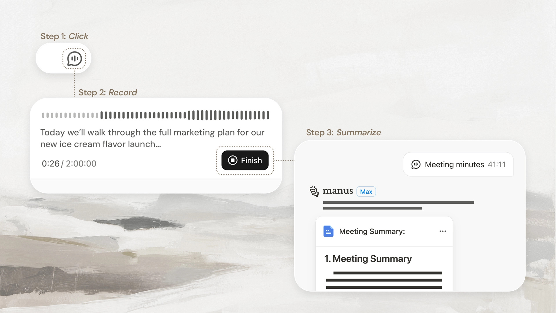 Manus presented Meeting Minutes. This new feature records your calls, transcribes everything, and generates usable meeting notes that include decisions, action items, and who said what.