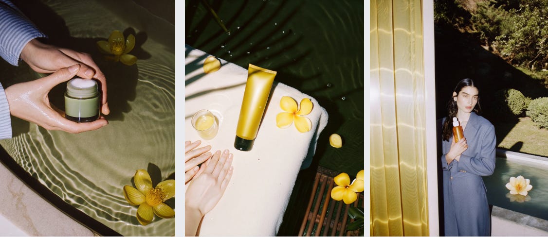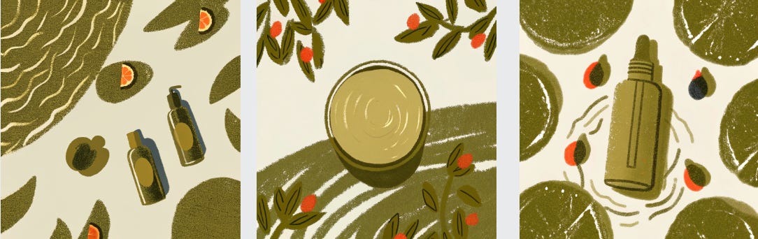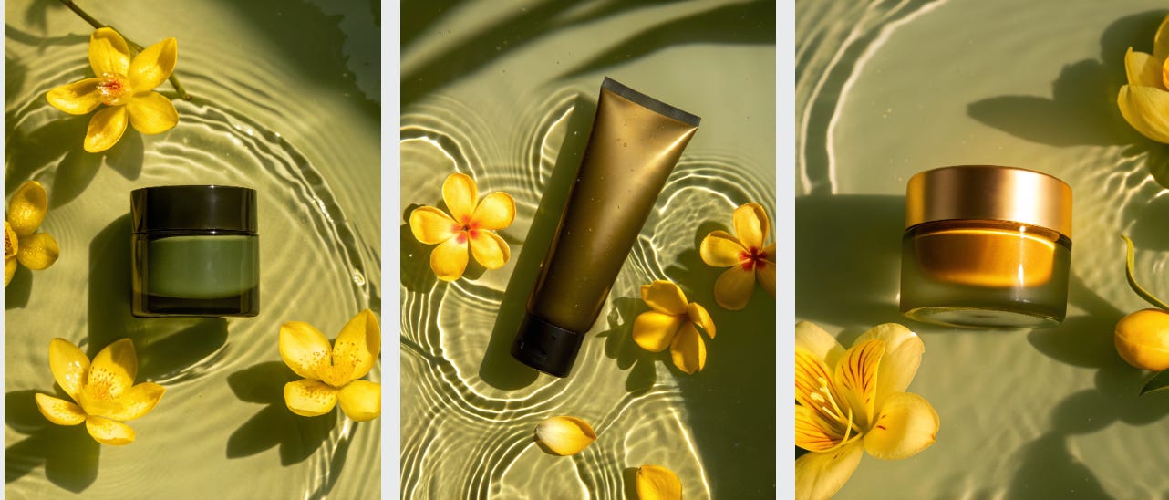 A glass jar of face cream in top-down product photography with a warm, sunlit aesthetic, crisp natural shadows, soft water ripple reflections, vibrant fruit accents, and a clean, minimal background that enhances the luxurious, organic feel.A tube of moisturizing lotion in top-down product photography with a warm, sunlit aesthetic, crisp natural shadows, soft water ripple reflections, vibrant fruit accents, and a clean, minimal background that enhances the luxurious, organic feel.A compact jar of night cream with a golden lid in top-down product photography with a warm, sunlit aesthetic, crisp natural shadows, soft water ripple reflections, vibrant fruit accents, and a clean, minimal background that enhances the luxurious, organic feel.If you are feeling experimental, definitely try to explore other styles.