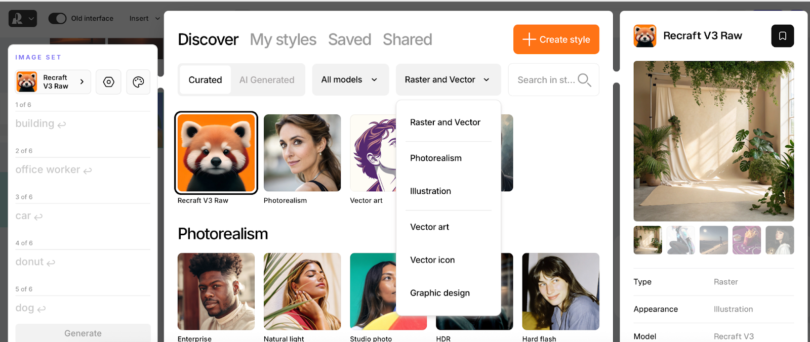 You can generate marketing-ready visuals with Recraft’s Photorealism Styles. No need for complex photo setups.