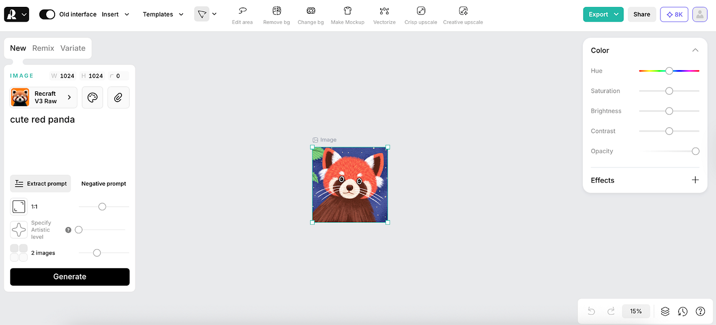 Even if the generated image is 99% there, you don’t have to restart. Recraft lets you refine the visuals without beginning from scratch.