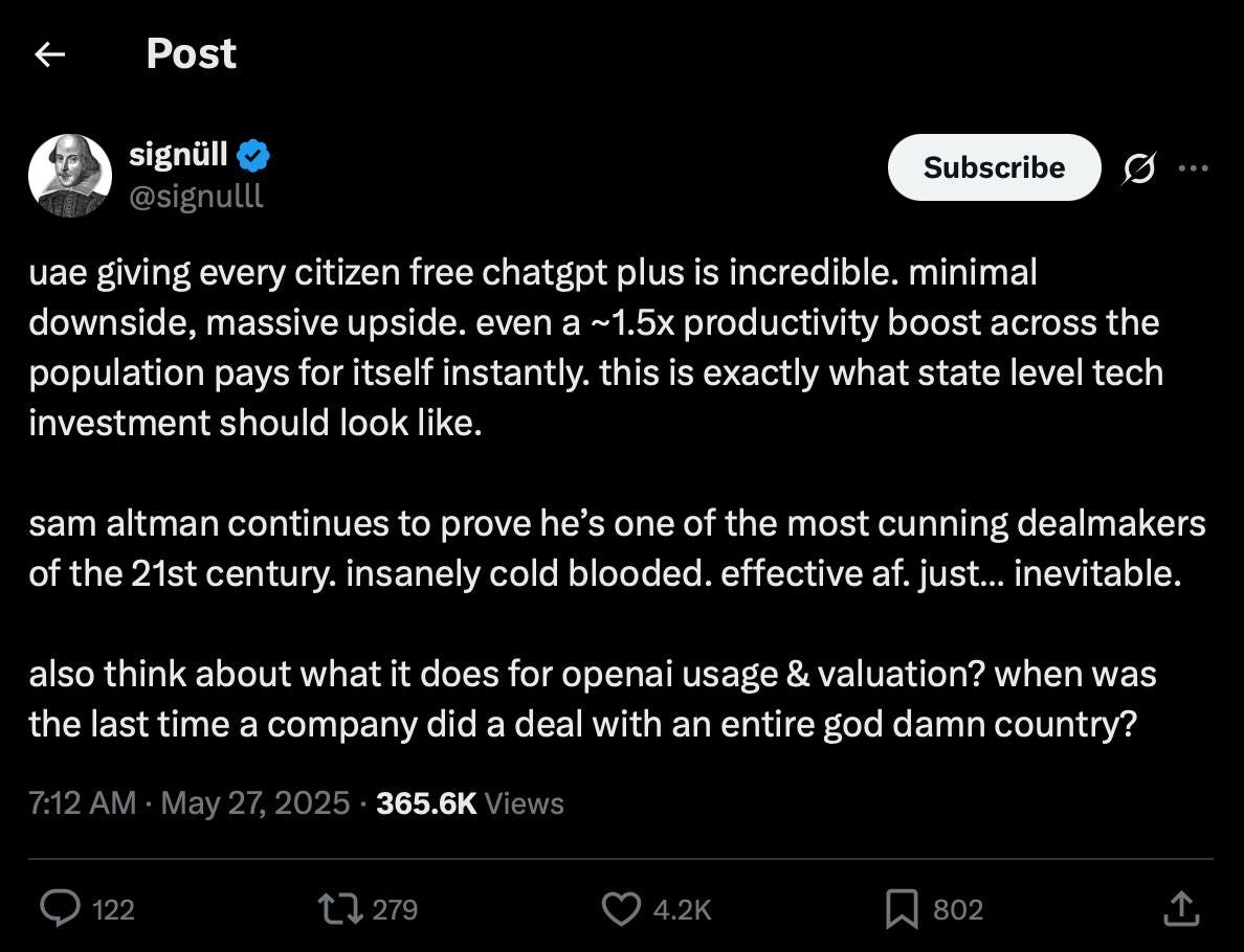 This is next level! Making deals not just with companies, but with entire countries. Altman has raised the game to a whole new height.