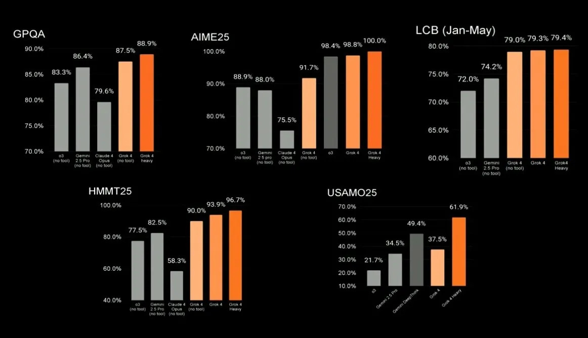 Grok 4 has surged to the top of benchmarks like ARC-AGI, leaving previous leaders like OpenAI’s o3, Claude Opus 4, and Gemini 2.5 Pro far behind. On Humanity’s Last Exam, Grok 4 Heavy hit an unmatched 44%, and even the standard Grok 4 is going toe-to-toe with OpenAI’s Deep Research and China’s Kimi Researcher. In independent testing, Grok 4 scored an Intelligence Index of 73 (higher than all its rivals) and ran a simulated vending machine business that doubled the profits of Claude 4 Opus and outperformed humans six times.
