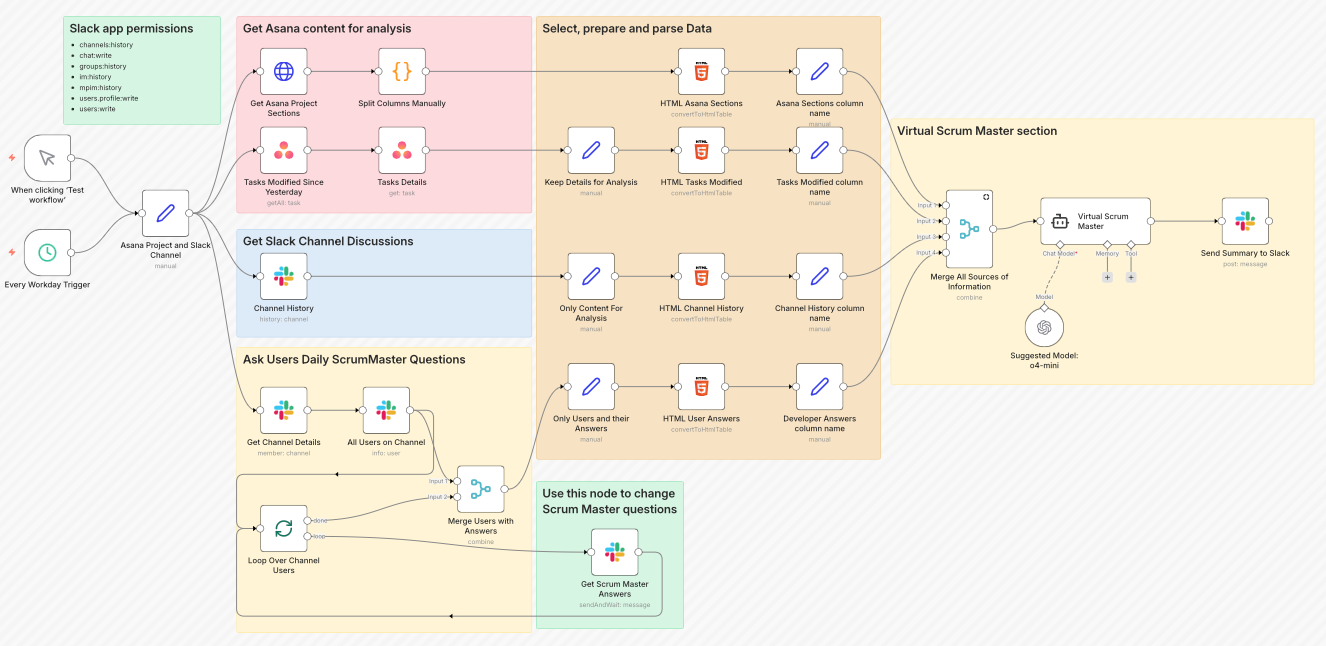 All of this runs through…n8n, of course! Then AI analyzes it in the context of Scrum, spotting potential roadblocks, areas where the team might need a hand, and risks of hitting sprint goals.