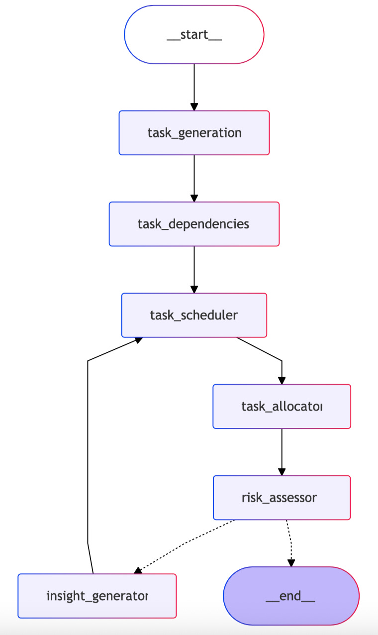 Workflow: The agent iterates through task generation → dependency mapping → scheduling → allocation → risk assessment → insight generation, optimizing each step based on feedback.
