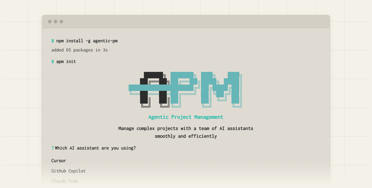 npm install agentic-pmInitialize your project in the terminal: