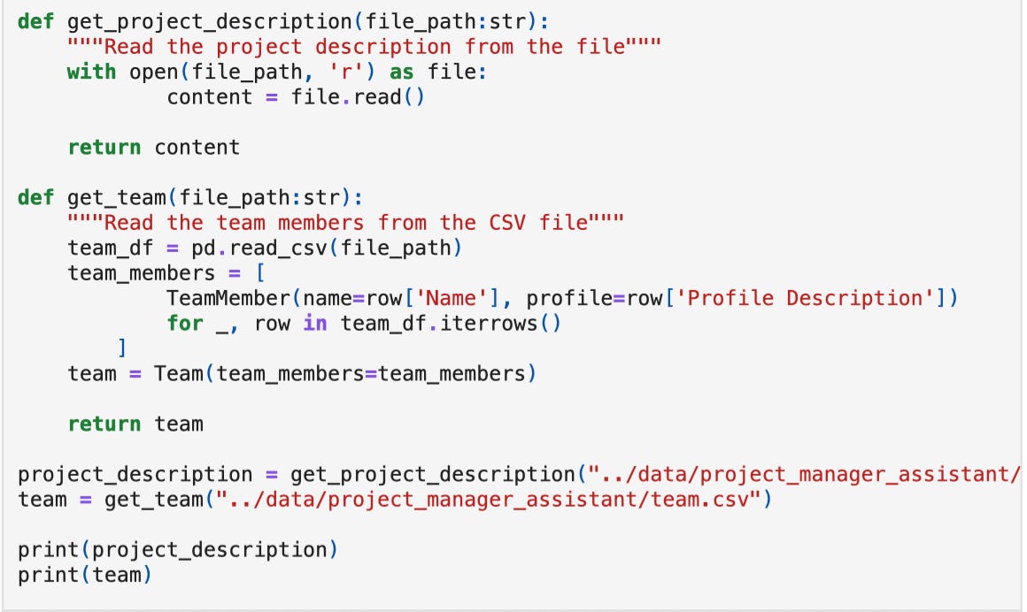 Inputs include project description files, team profiles, and task details.