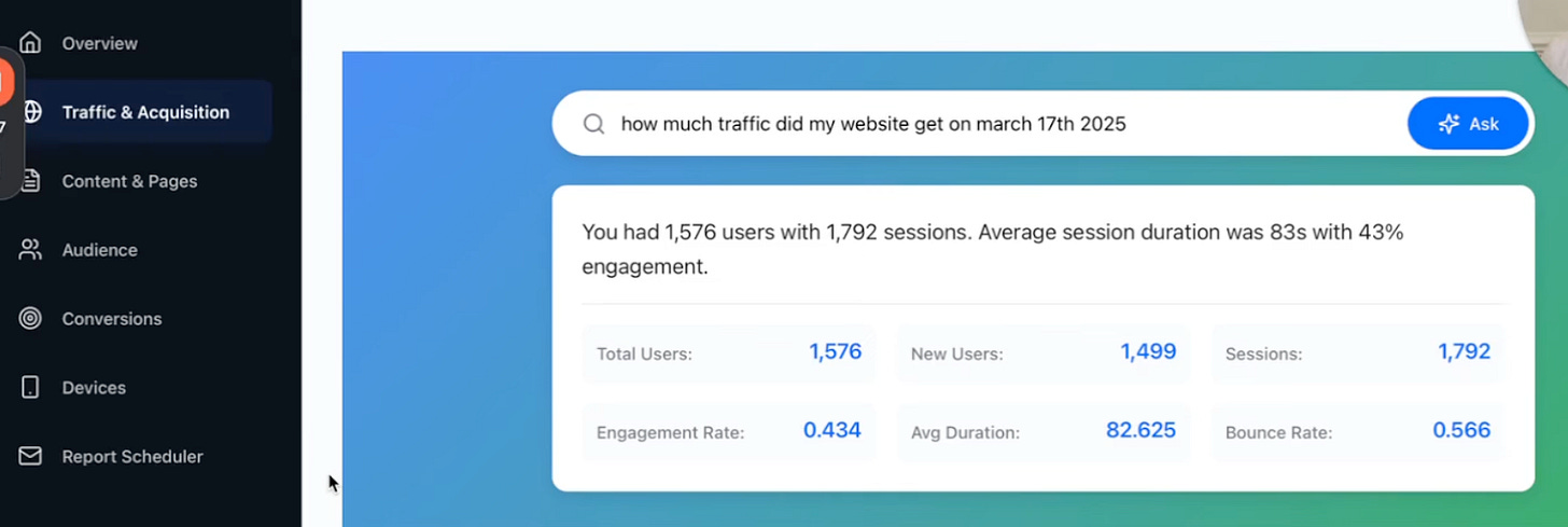 In this case, we connect Claude directly to GA4. You can ask things in plain English, and Claude instantly sends you all the numbers.