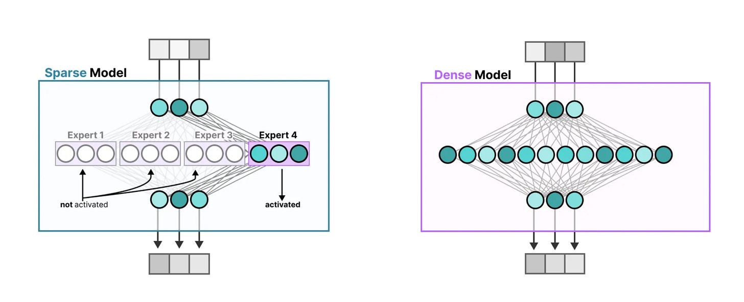 These images show a clear comparison between Spare and Dense Models. In dense models, all parts of the network are active for every input which makes them powerful but inefficient. In sparse models , only a few specialized “experts” are activated based on the input, which reduces computation and scales better. Instead of firing up the entire model, it picks just the right parts for the job, like calling in specialists instead of the whole team.