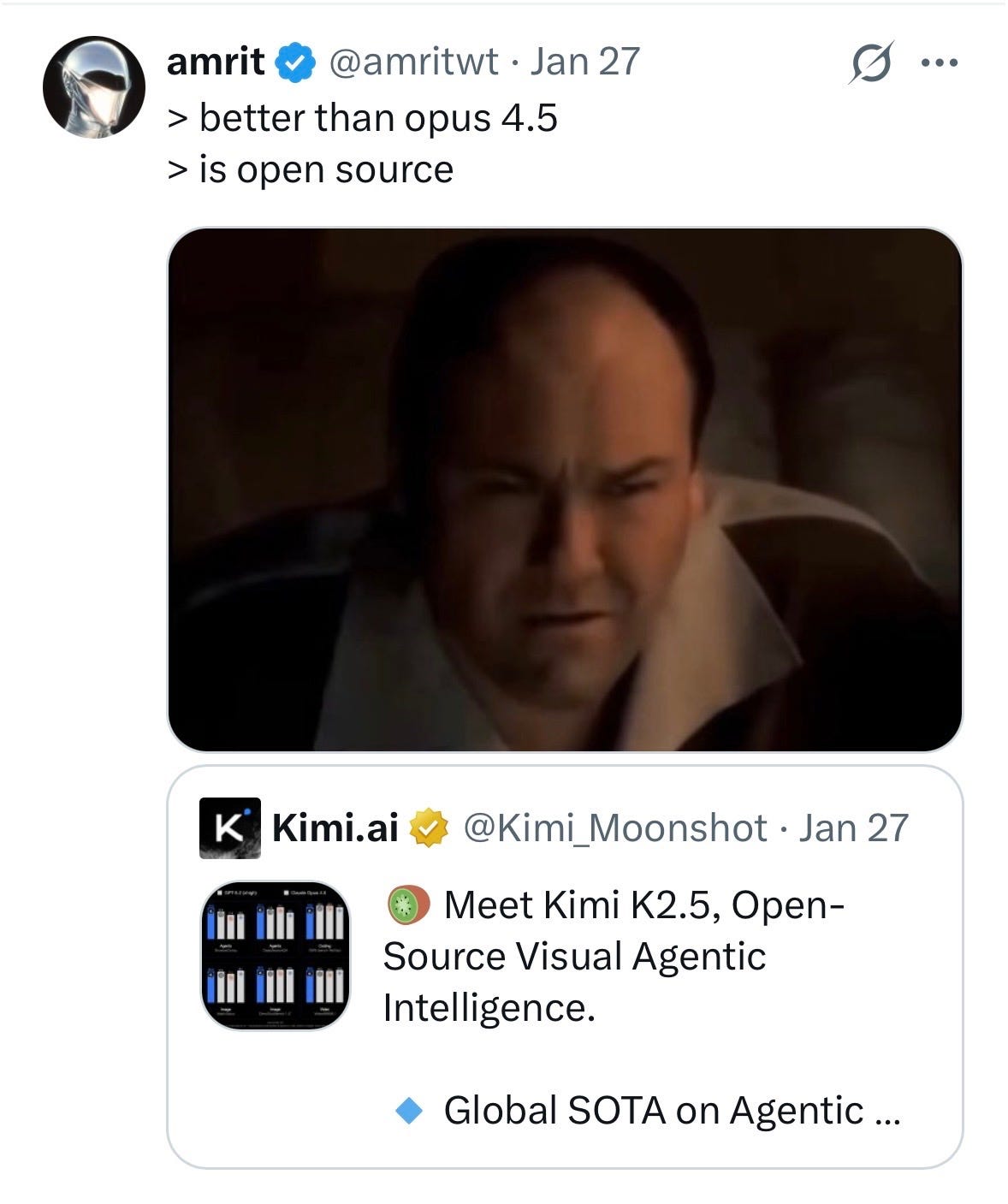 Moonshot AI released Kimi K2.5, an open-source multimodal model built for agent swarms, not just chat. What really caught attention is that, on several key benchmarks, it outperforms GPT-5.2 and Claude Opus 4.5 (well-well-well, it’s already sparked millions of memes on X)