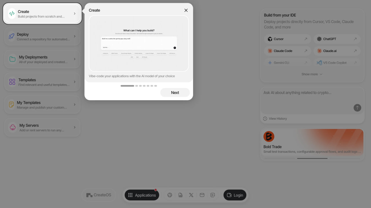 ⭐ CreateOS — Build and deploy apps from any AI coding tool, in one place. Works with Claude Code, Cursor, Lovable, and v0. The missing “last mile” layer between vibe-coded output and actual deployment.