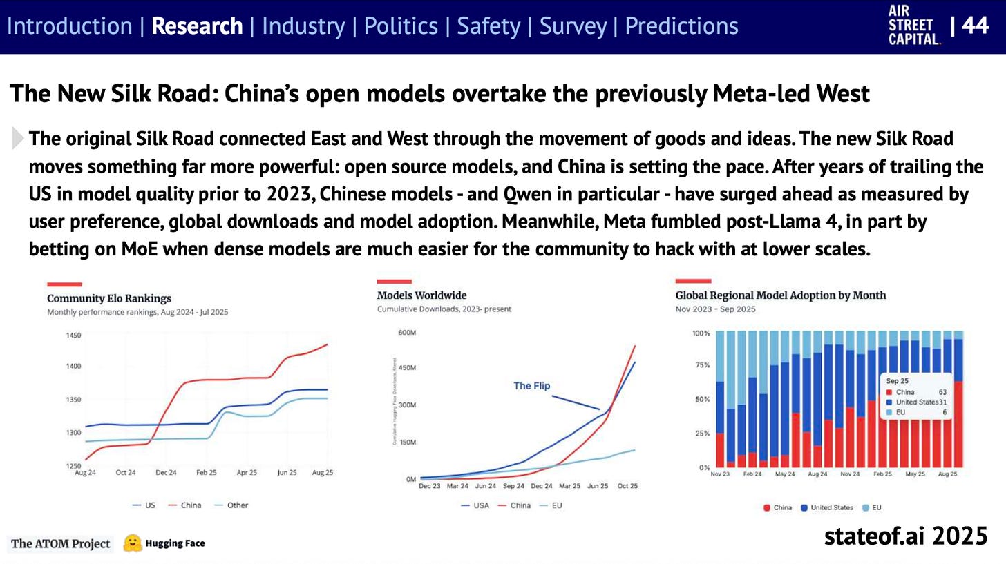In turn, China, hit by US export bans on NVIDIA chips, has doubled down on open-source models and state-led investment. Instead of chasing NVIDIA’s pace, Beijing is assembling an “Open Silk Road” of tools, weights, and communities that appeal to nations wary of U.S. control (oh, politics), a strategy resembling Android’s rise against Apple’s closed system.